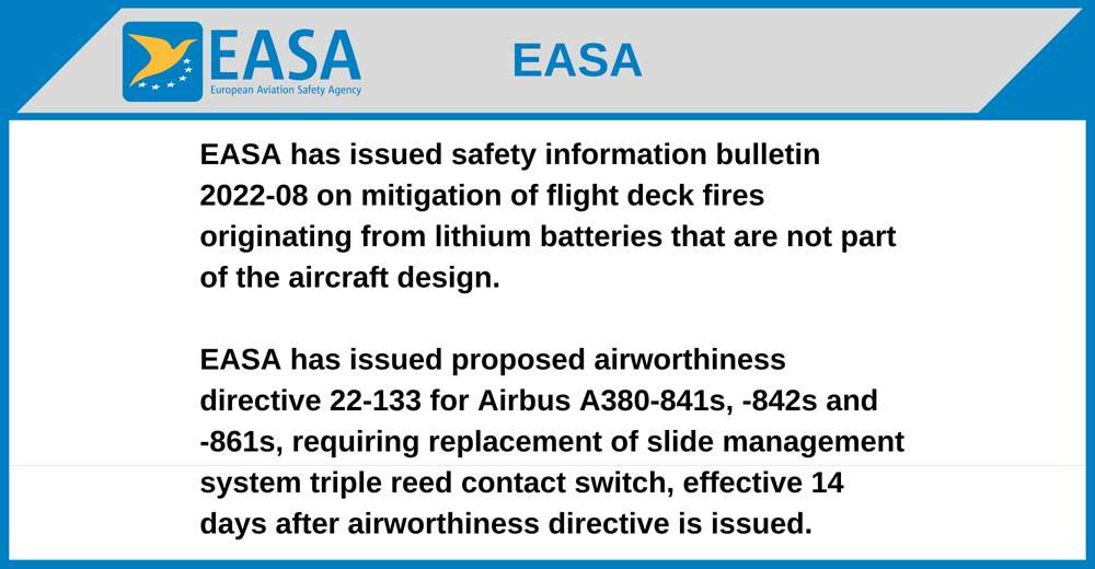 EASA has issued safety information bulletin 2022-08 on mitigation of flight deck fires originating from lithium batteries that are not part of the aircraft design.