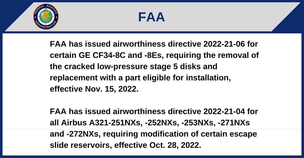 FAA has issued airworthiness directive 2022-21-04 for all Airbus A321-251NXs, -252NXs, -253NXs, -271NXs and -272NXs, requiring modification of certain escape slide reservoirs, effective Oct. 28, 2022.