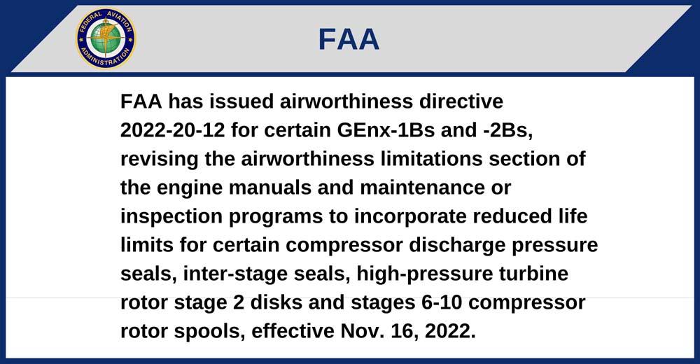 FAA has issued airworthiness directive 2022-20-12 for certain GEnx-1Bs and -2Bs, revising the airworthiness limitations section of the engine manuals and maintenance or inspection programs to incorporate reduced life limits for certain compressor discharge pressure seals, inter-stage seals, high-pressure turbine rotor stage 2 disks and stages 6-10 compressor rotor spools, effective Nov. 16, 2022.
