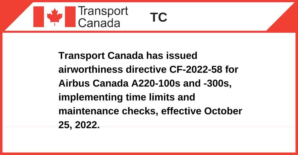 Transport Canada has issued airworthiness directive CF-2022-58 for Airbus Canada A220-100s and -300s, implementing time limits and maintenance checks, effective October 25, 2022.