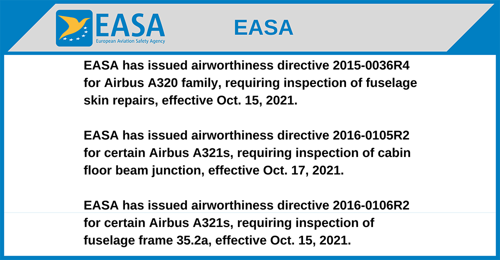 EASA has issued airworthiness directive 2016-0105R2 for certain Airbus A321s, requiring inspection of cabin floor beam junction, effective Oct. 17, 2021.