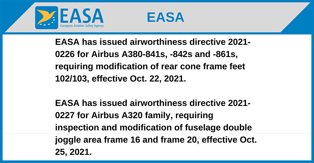 EASA has issued airworthiness directive 2021-0226 for Airbus A380-841s, -842s and -861s, requiring modification of rear cone frame feet 102/103, effective Oct. 22, 2021.
