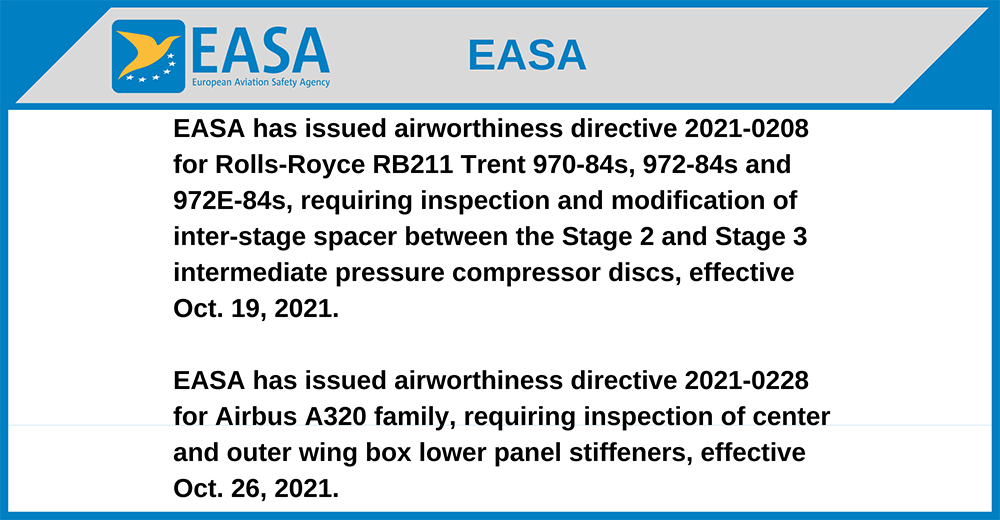 EASA has issued airworthiness directive 2021-0208 for Rolls-Royce RB211 Trent 970-84s, 972-84s and 972E-84s, requiring inspection and modification of inter-stage spacer between the Stage 2 and Stage 3 intermediate pressure compressor discs, effective Oct. 19, 2021.