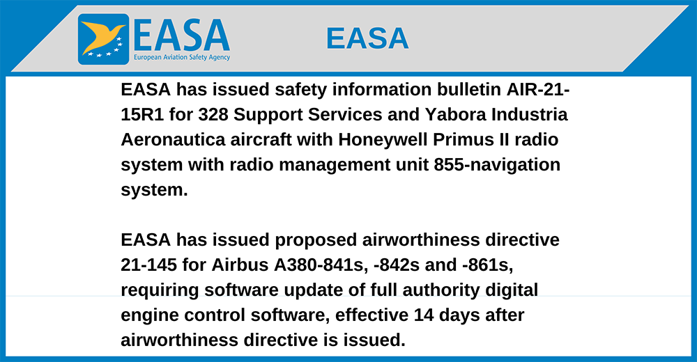 EASA has issued proposed airworthiness directive 21-145 for Airbus A380-841s, -842s and -861s, requiring software update of full authority digital engine control software, effective 14 days after airworthiness directive is issued.