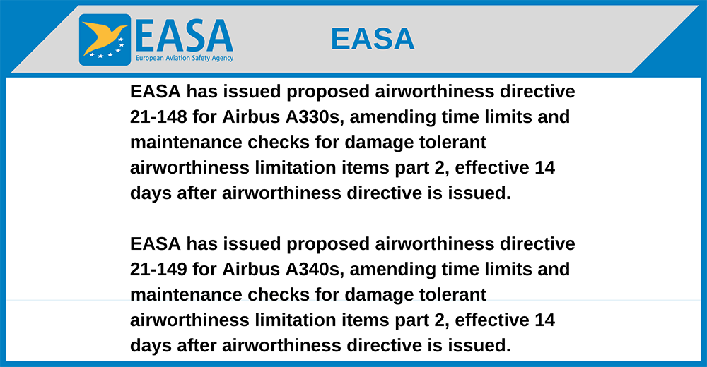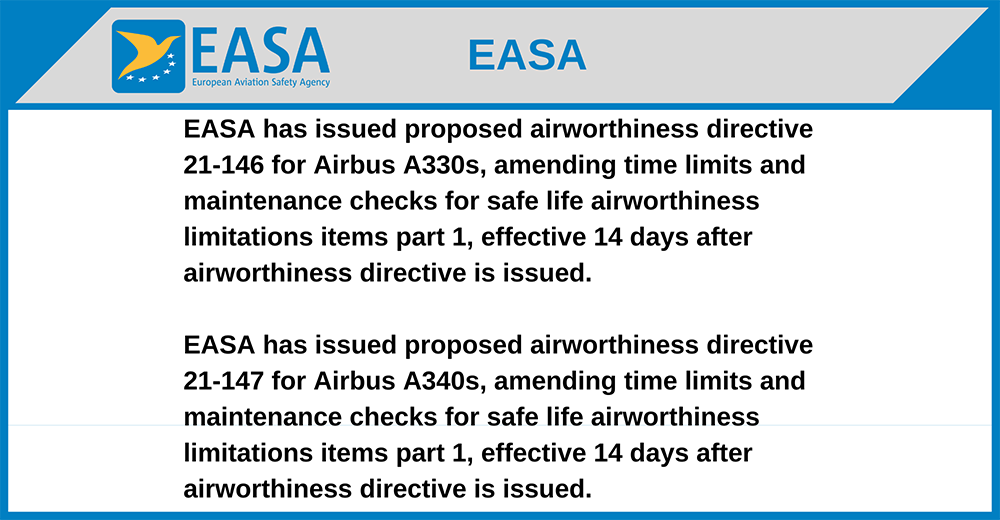 EASA has issued proposed airworthiness directive 21-146 for Airbus A330s, amending time limits and maintenance checks for safe life airworthiness limitations items part 1, effective 14 days after airworthiness directive is issued.