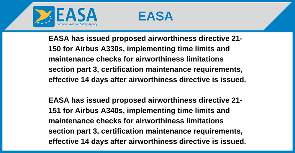 EASA has issued proposed airworthiness directive 21-150 for Airbus A330s, implementing time limits and maintenance checks for airworthiness limitations section part 3, certification maintenance requirements, effective 14 days after airworthiness directive is issued.