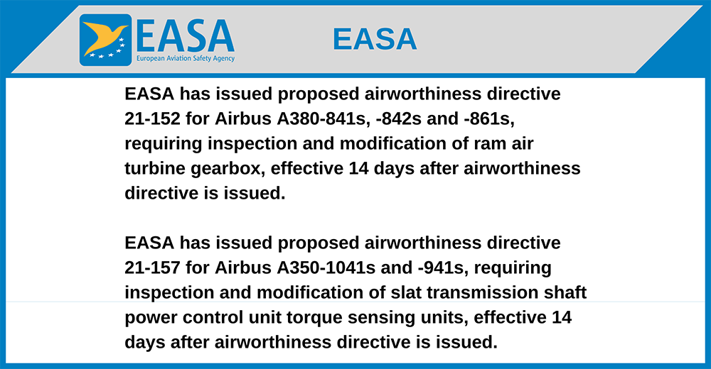 EASA has issued proposed airworthiness directive 21-152 for Airbus A380-841s, -842s and -861s, requiring inspection and modification of ram air turbine gearbox, effective 14 days after airworthiness directive is issued.