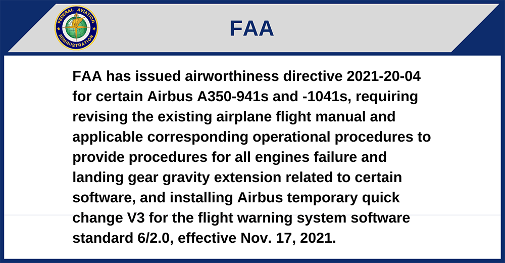 FAA has issued airworthiness directive 2021-20-04 for certain Airbus A350-941s and -1041s, requiring revising the existing airplane flight manual and applicable corresponding operational procedures to provide procedures for all engines failure and landing gear gravity extension related to certain software, and installing Airbus temporary quick change V3 for the flight warning system software standard 6/2.0, effective Nov. 17, 2021.