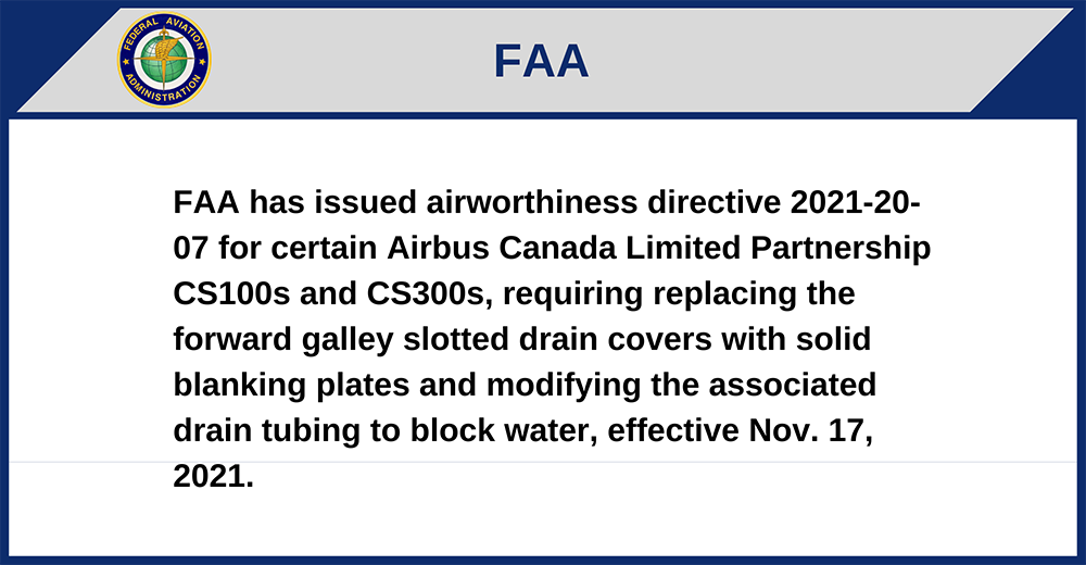 FAA has issued airworthiness directive 2021-20-07 for certain Airbus Canada Limited Partnership CS100s and CS300s, requiring replacing the forward galley slotted drain covers with solid blanking plates and modifying the associated drain tubing to block water, effective Nov. 17, 2021.