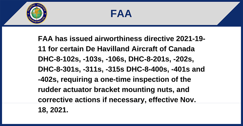 FAA has issued airworthiness directive 2021-19-11 for certain De Havilland Aircraft of Canada DHC-8-102s, -103s, -106s, DHC-8-201s, -202s, DHC-8-301s, -311s, -315s DHC-8-400s, -401s and -402s, requiring a one-time inspection of the rudder actuator bracket mounting nuts, and corrective actions if necessary, effective Nov. 18, 2021.