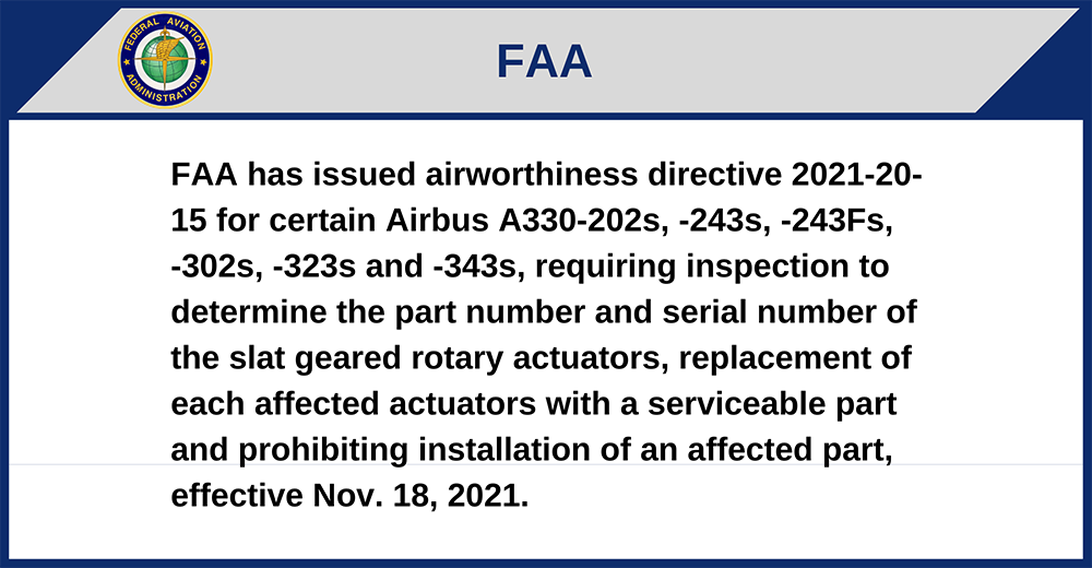 FAA has issued airworthiness directive 2021-20-15 for certain Airbus A330-202s, -243s, -243Fs, -302s, -323s and -343s, requiring inspection to determine the part number and serial number of the slat geared rotary actuators, replacement of each affected actuators with a serviceable part and prohibiting installation of an affected part, effective Nov. 18, 2021.