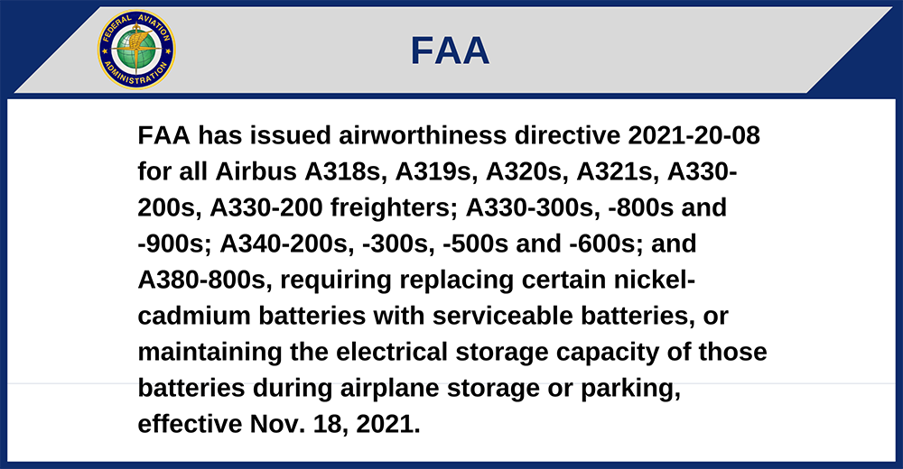 FAA has issued airworthiness directive 2021-20-08 for all Airbus A318s, A319s, A320s, A321s, A330-200s, A330-200 freighters; A330-300s, -800s and -900s; A340-200s, -300s, -500s and -600s; and A380-800s, requiring replacing certain nickel-cadmium batteries with serviceable batteries, or maintaining the electrical storage capacity of those batteries during airplane storage or parking, effective Nov. 18, 2021.