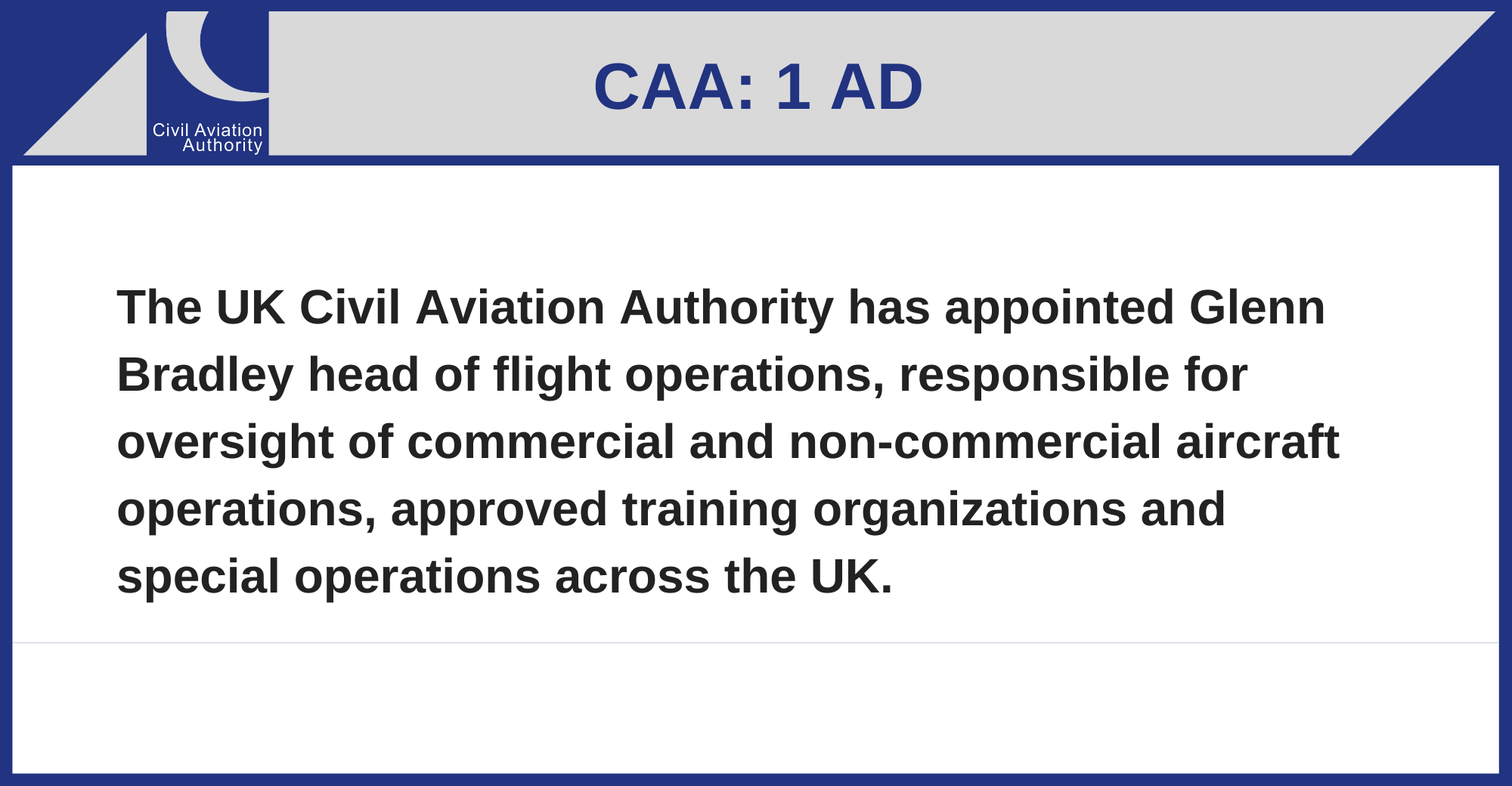 The UK Civil Aviation Authority has appointed Glenn Bradley head of flight operations, responsible for oversight of commercial and non-commercial aircraft operations, approved training organizations and special operations across the UK.