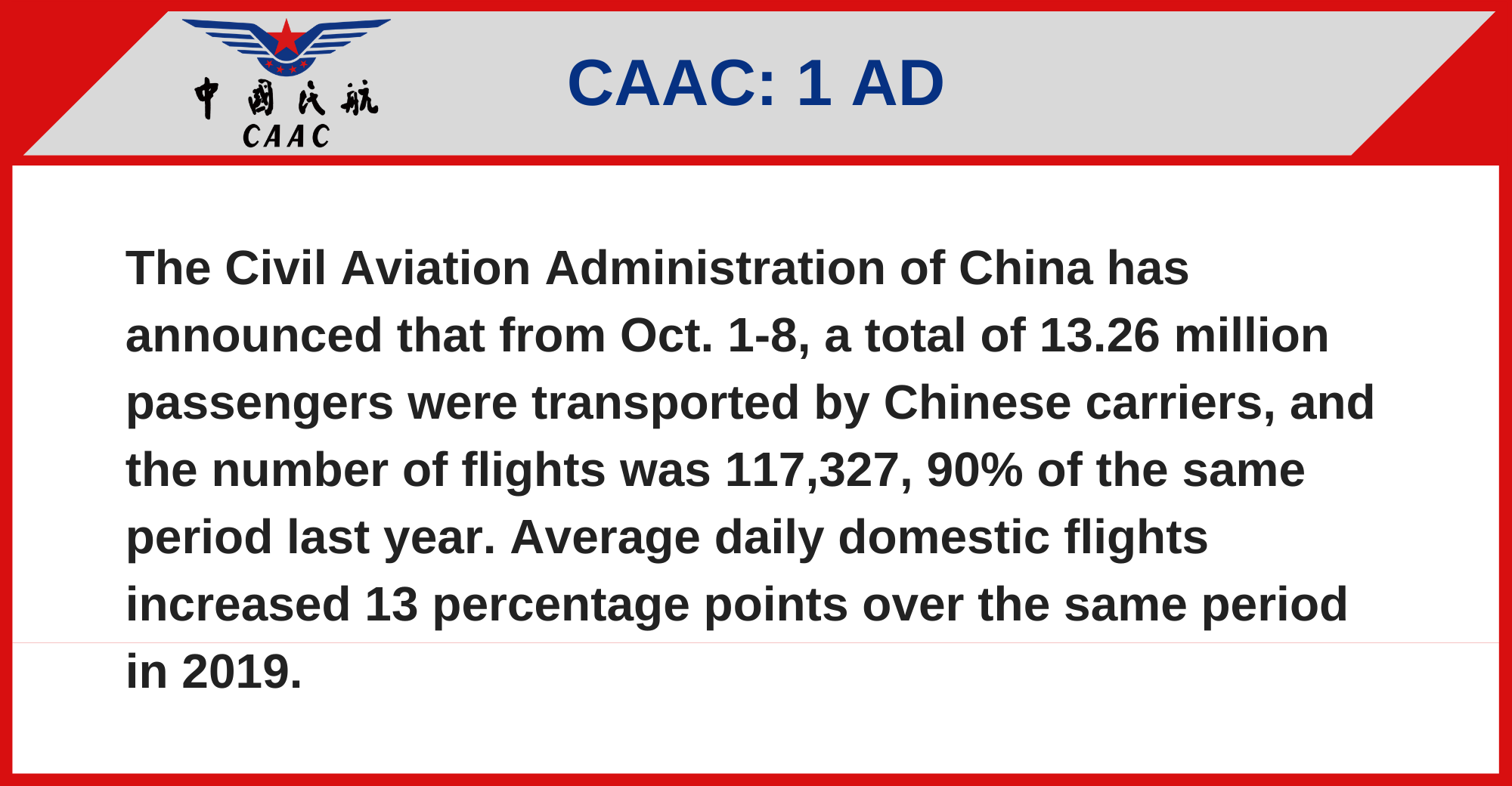 The Civil Aviation Administration of China has announced that from Oct. 1-8, a total of 13.26 million passengers were transported by Chinese carriers, and the number of flights was 117,327, 90% of the same period last year. Average daily domestic flights increased 13 percentage points over the same period in 2019.