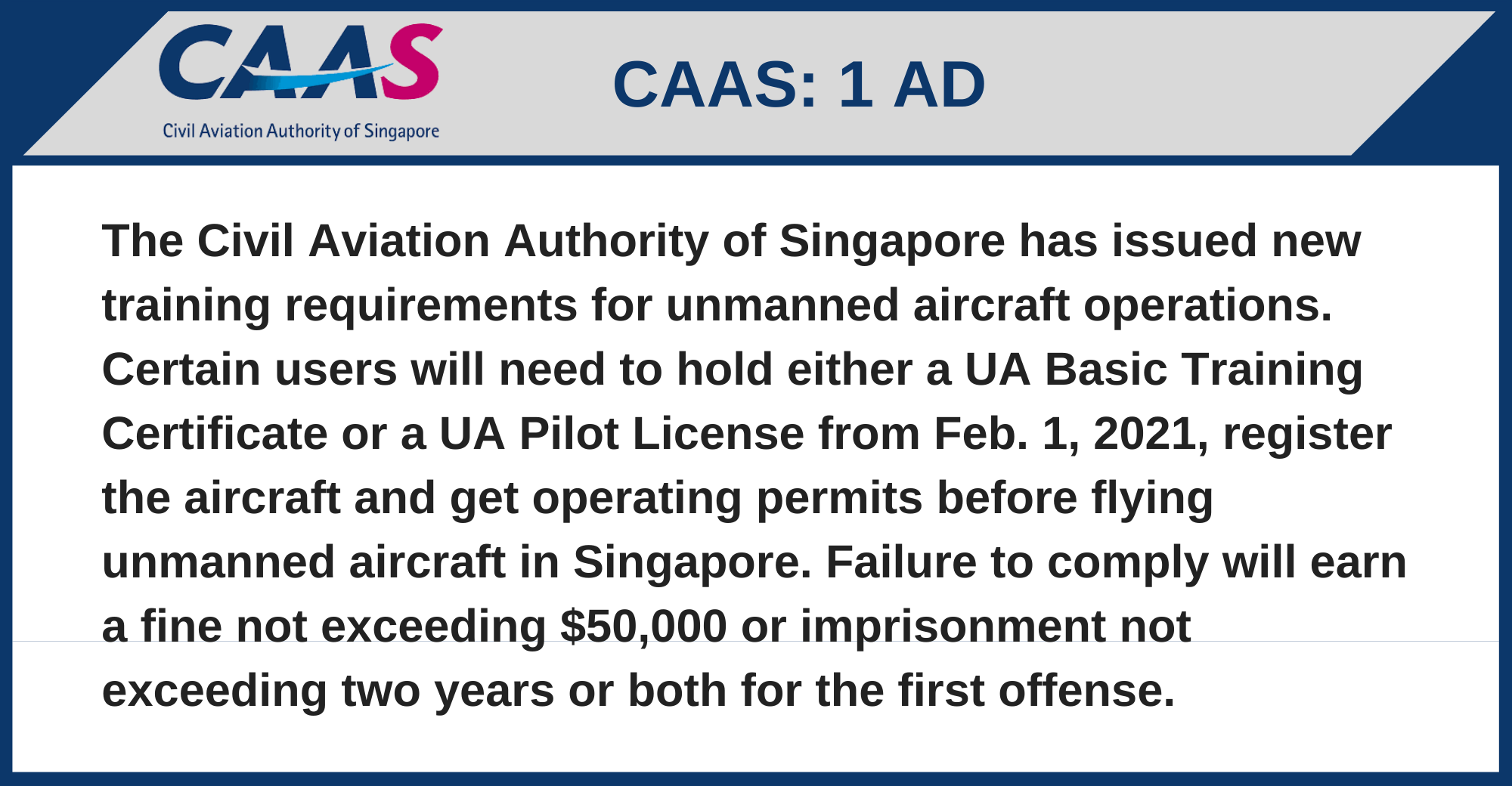 The Civil Aviation Authority of Singapore has issued new training requirements for unmanned aircraft operations. Certain users will need to hold either a UA Basic Training Certificate or a UA Pilot License from Feb. 1, 2021, register the aircraft and get operating permits before flying unmanned aircraft in Singapore. Failure to comply will earn a fine not exceeding $50,000 or imprisonment not exceeding two years or both for the first offense.