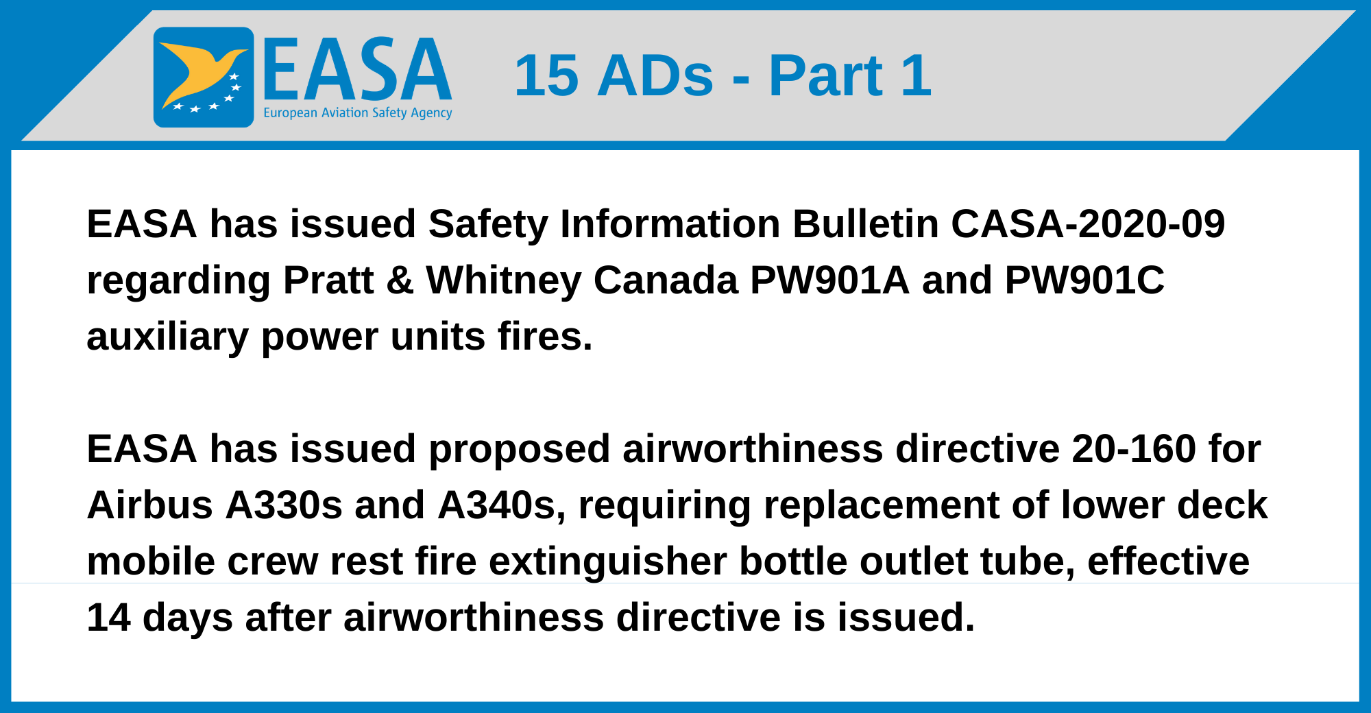 EASA has issued Safety Information Bulletin CASA-2020-09 regarding Pratt & Whitney Canada PW901A and PW901C auxiliary power units fires.