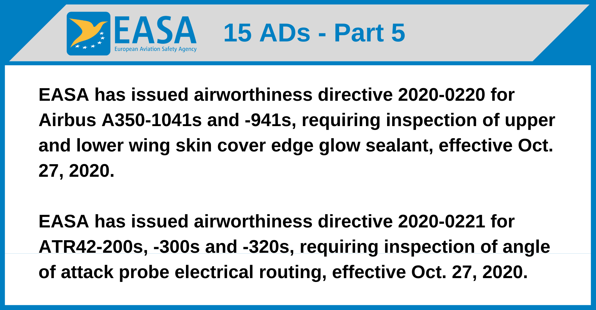 EASA has issued airworthiness directive 2020-0220 for Airbus A350-1041s and -941s, requiring inspection of upper and lower wing skin cover edge glow sealant, effective Oct. 27, 2020.