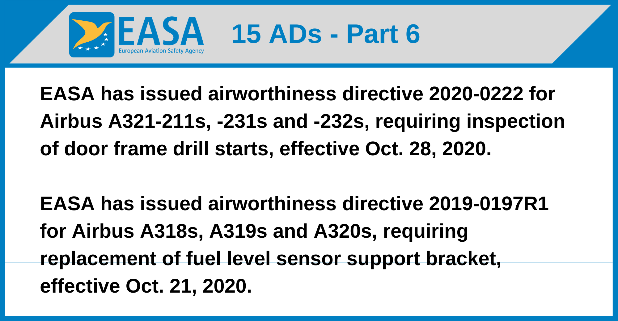 EASA has issued airworthiness directive 2020-0222 for Airbus A321-211s, -231s and -232s, requiring inspection of door frame drill starts, effective Oct. 28, 2020.