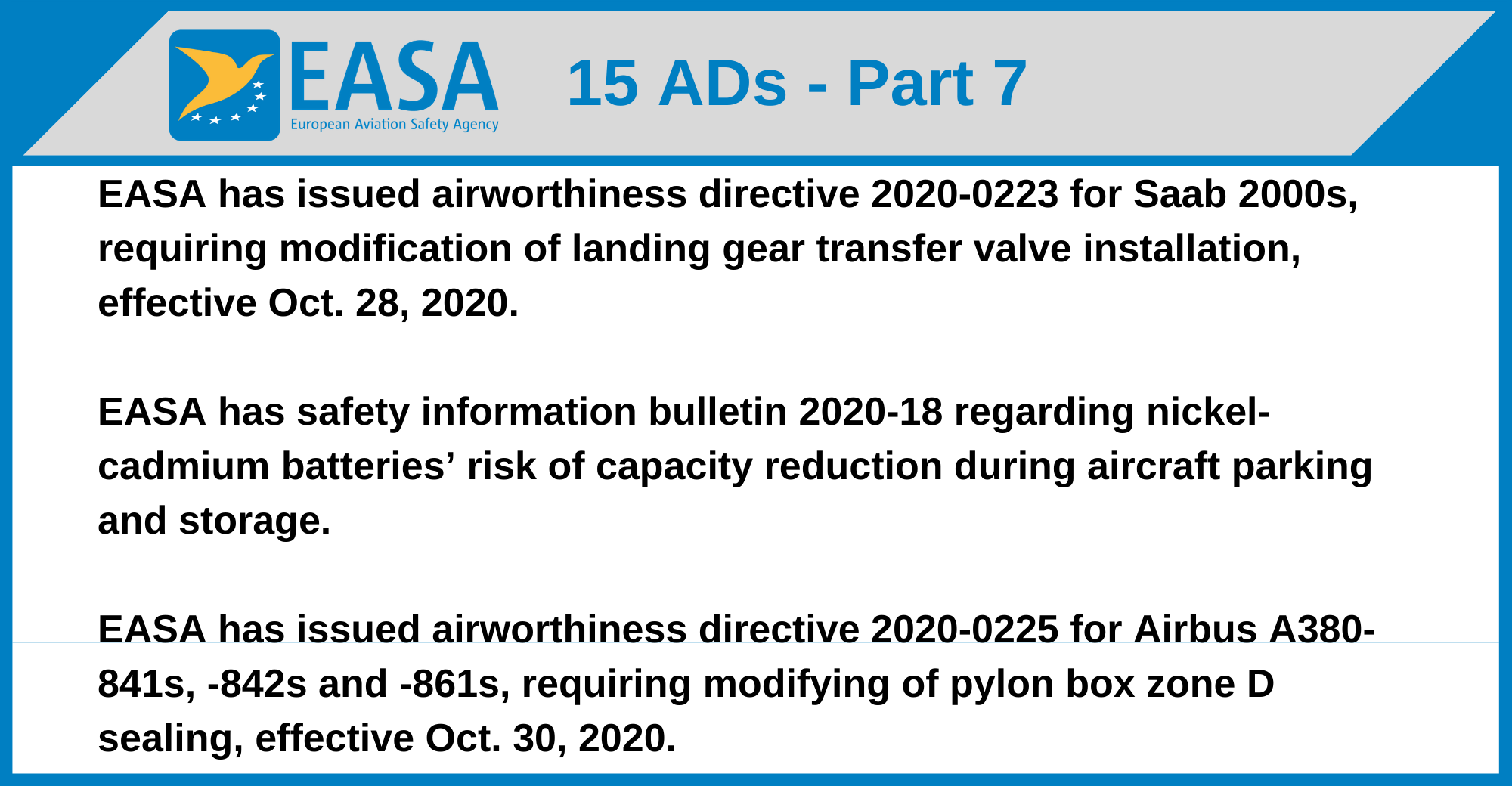 EASA has safety information bulletin 2020-18 regarding nickel-cadmium batteries’ risk of capacity reduction during aircraft parking and storage.
