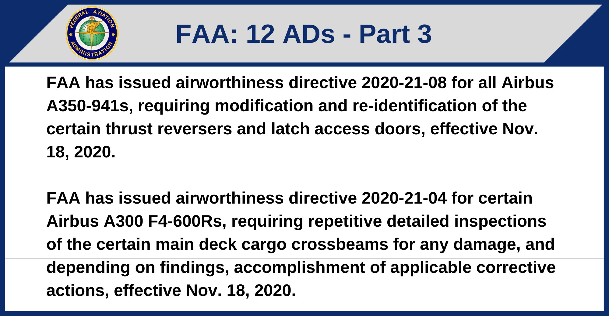 FAA has issued airworthiness directive 2020-21-06 for certain Airbus A350-941s and -1041s, requiring revising maintenance or inspection program to incorporate new or more restrictive airworthiness limitations, effective Nov. 18, 2020.