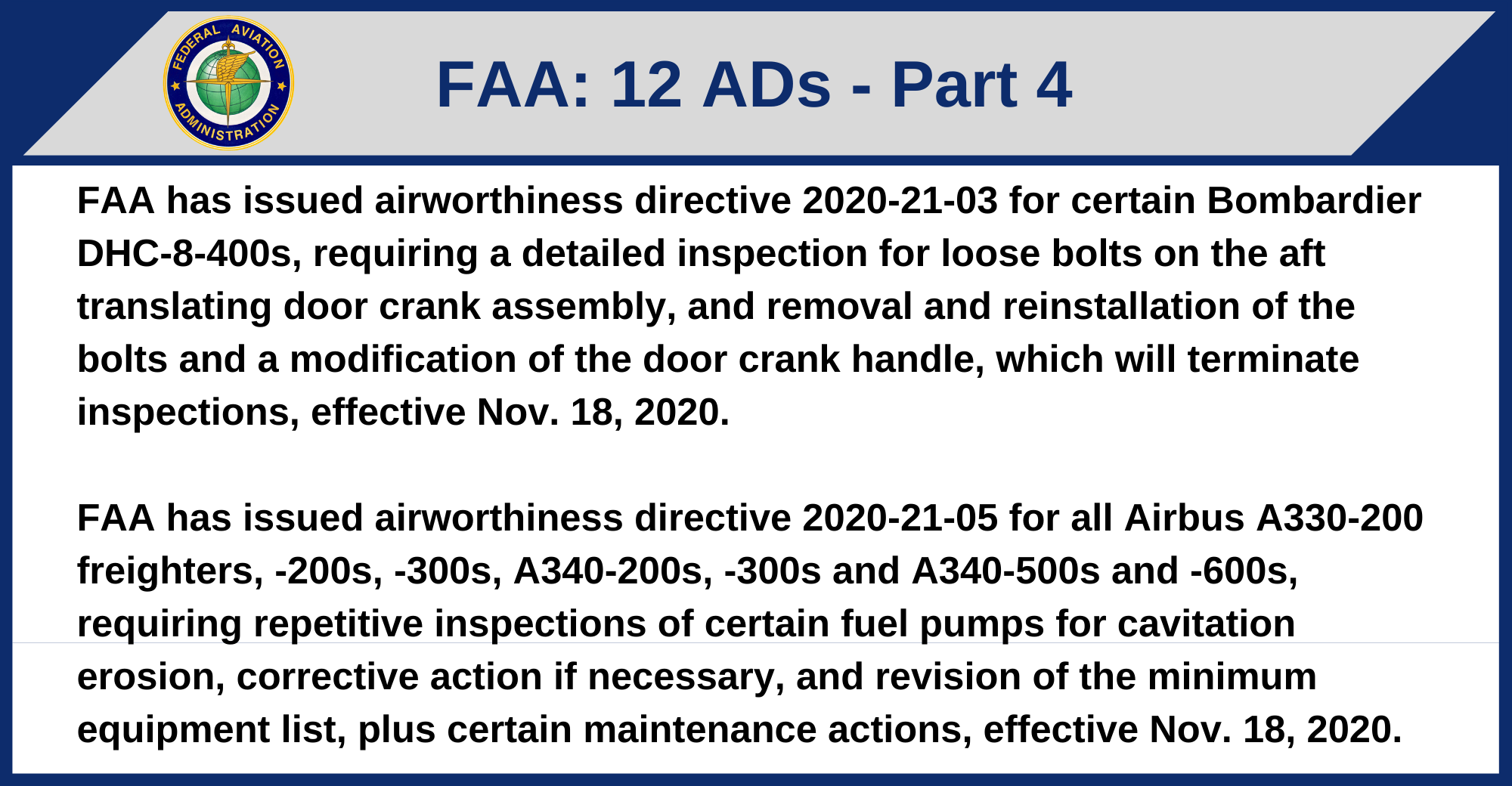 FAA has issued airworthiness directive 2020-21-05 for all Airbus A330-200 freighters, -200s, -300s, A340-200s, -300s and A340-500s and -600s, requiring repetitive inspections of certain fuel pumps for cavitation erosion, corrective action if necessary, and revision of the minimum equipment list, plus certain maintenance actions, effective Nov. 18, 2020.