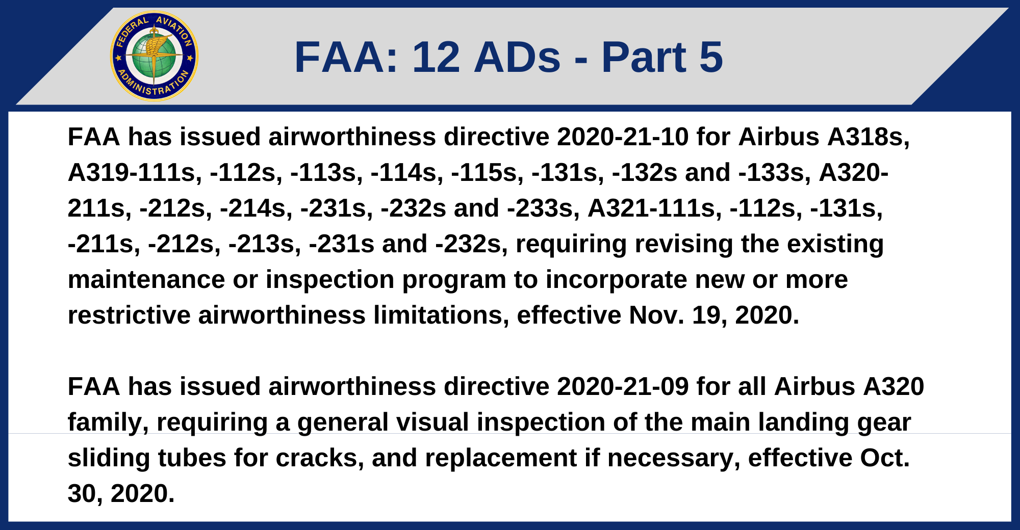 FAA has issued airworthiness directive 2020-21-09 for all Airbus A320 family, requiring a general visual inspection of the main landing gear sliding tubes for cracks, and replacement if necessary, effective Oct. 30, 2020.