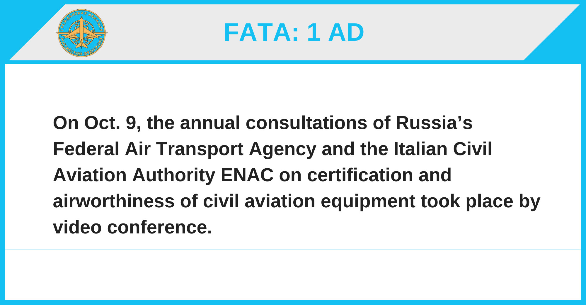 On Oct. 9, the annual consultations of Russia’s Federal Air Transport Agency and the Italian Civil Aviation Authority ENAC on certification and airworthiness of civil aviation equipment took place by video conference.