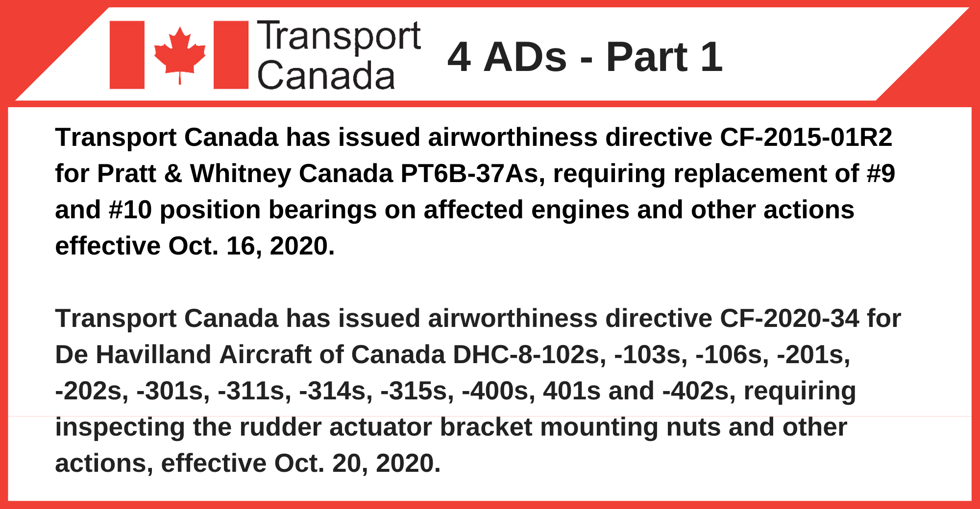 Transport Canada has issued airworthiness directive CF-2020-34 for De Havilland Aircraft of Canada DHC-8-102s, -103s, -106s, -201s, -202s, -301s, -311s, -314s, -315s, -400s, 401s and -402s, requiring inspecting the rudder actuator bracket mounting nuts and other actions, effective Oct. 20, 2020.