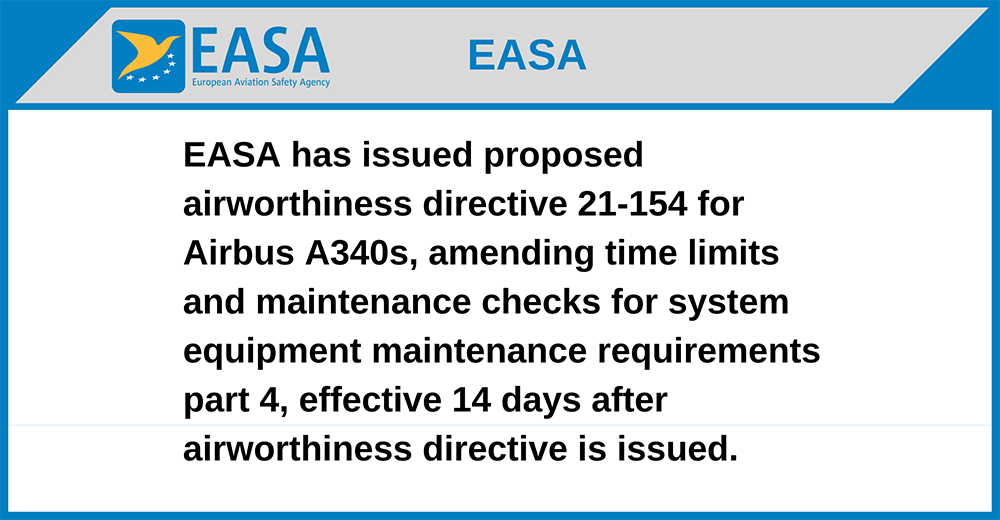 EASA has issued proposed airworthiness directive 21-154 for Airbus A340s, amending time limits and maintenance checks for system equipment maintenance requirements part 4, effective 14 days after airworthiness directive is issued.