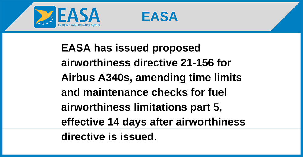 EASA has issued proposed airworthiness directive 21-156 for Airbus A340s, amending time limits and maintenance checks for fuel airworthiness limitations part 5, effective 14 days after airworthiness directive is issued.