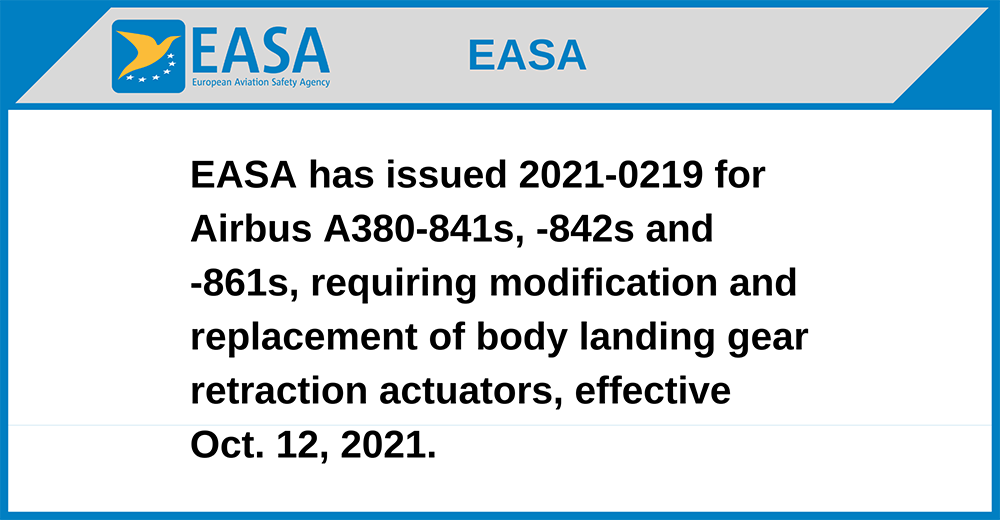 EASA has issued 2021-0219 for Airbus A380-841s, -842s and -861s, requiring modification and replacement of body landing gear retraction actuators, effective Oct. 12, 2021.