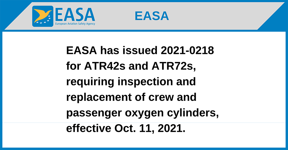 EASA has issued 2021-0218 for ATR42s and ATR72s, requiring inspection and replacement of crew and passenger oxygen cylinders, effective Oct. 11, 2021.