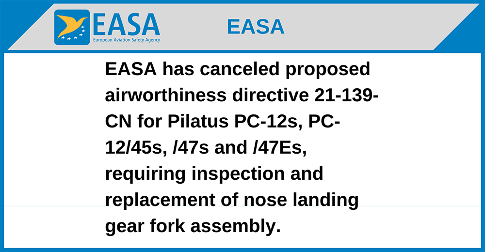 EASA has canceled proposed airworthiness directive 21-139-CN for Pilatus PC-12s, PC-12/45s, /47s and /47Es, requiring inspection and replacement of nose landing gear fork assembly.