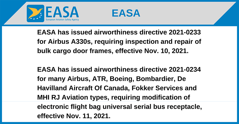 EASA has issued airworthiness directive 2021-0233 for Airbus A330s, requiring inspection and repair of bulk cargo door frames, effective Nov. 10, 2021.
