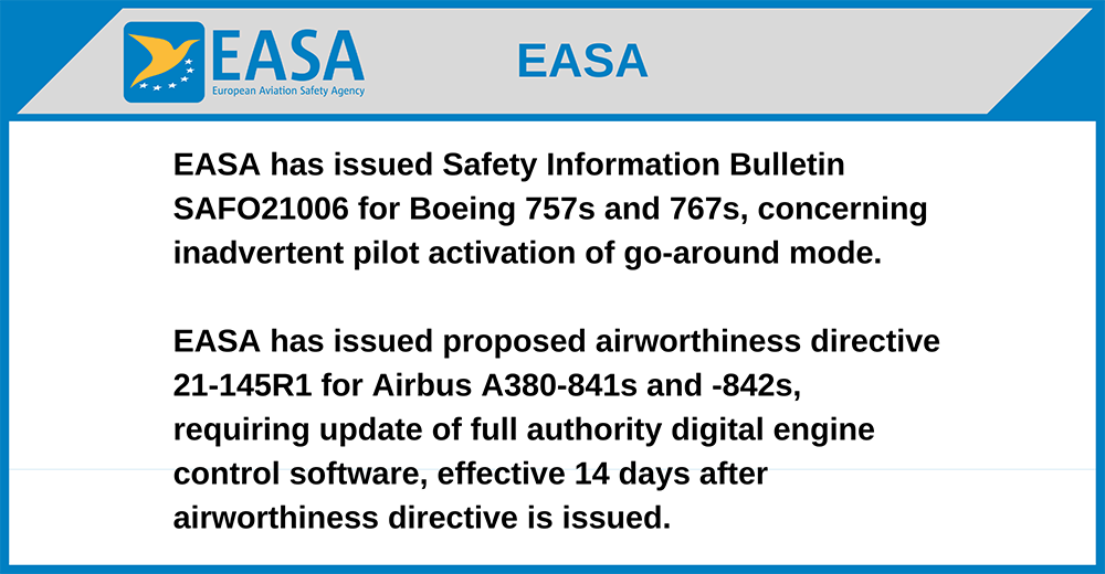 EASA has issued Safety Information Bulletin SAFO21006 for Boeing 757s and 767s, concerning inadvertent pilot activation of go-around mode.
