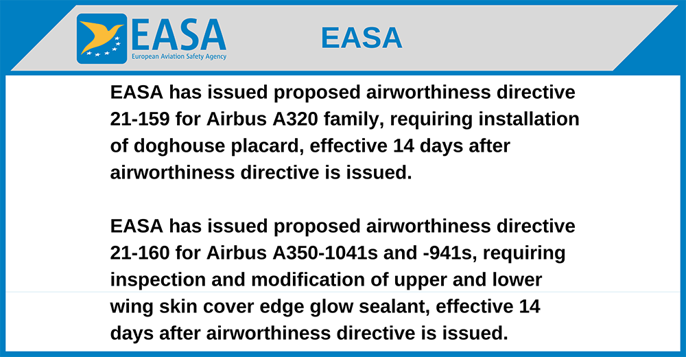 EASA has issued proposed airworthiness directive 21-159 for Airbus A320 family, requiring installation of doghouse placard, effective 14 days after airworthiness directive is issued.