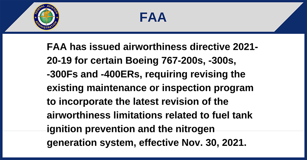 FAA has issued airworthiness directive 2021-20-19 for certain Boeing 767-200s, -300s, -300Fs and -400ERs, requiring revising the existing maintenance or inspection program to incorporate the latest revision of the airworthiness limitations related to fuel tank ignition prevention and the nitrogen generation system, effective Nov. 30, 2021.