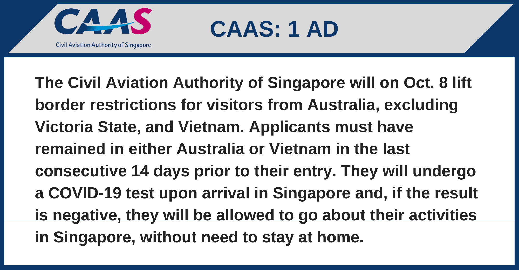 The Civil Aviation Authority of Singapore will on Oct. 8 lift border restrictions for visitors from Australia, excluding Victoria State, and Vietnam. Applicants must have remained in either Australia or Vietnam in the last consecutive 14 days prior to their entry. They will undergo a COVID-19 test upon arrival in Singapore and, if the result is negative, they will be allowed to go about their activities in Singapore, without need to stay at home.