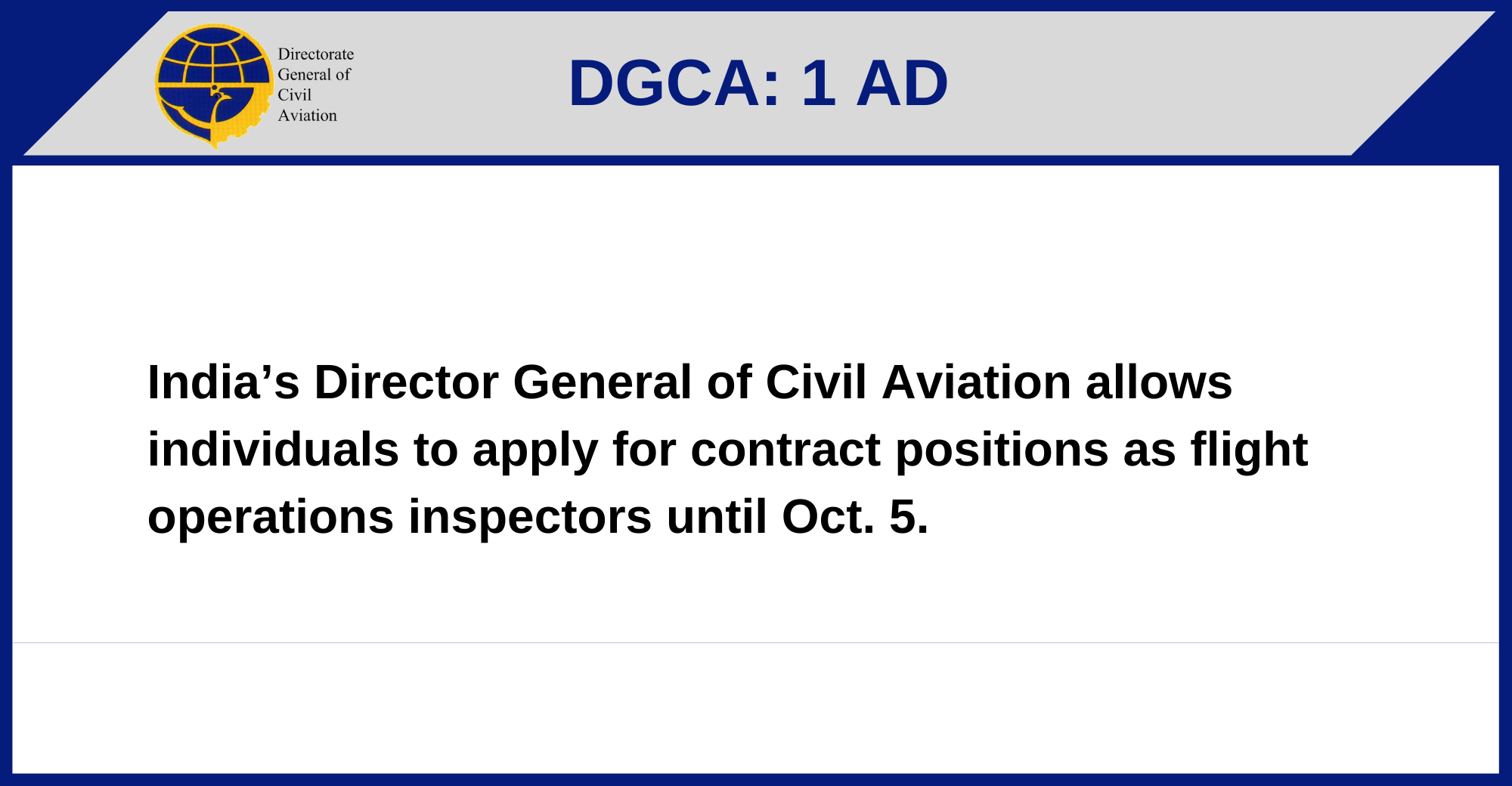 India’s Director General of Civil Aviation allows individuals to apply for contract positions as flight operations inspectors until Oct. 5.