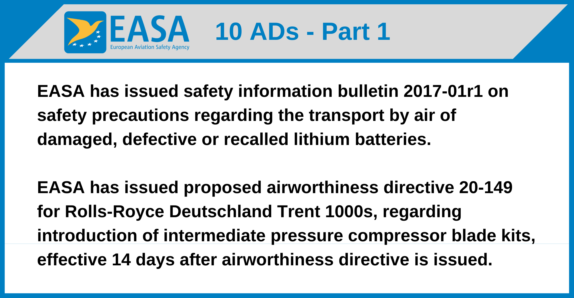 EASA has issued safety information bulletin 2017-01r1 on safety precautions regarding the transport by air of damaged, defective or recalled lithium batteries.