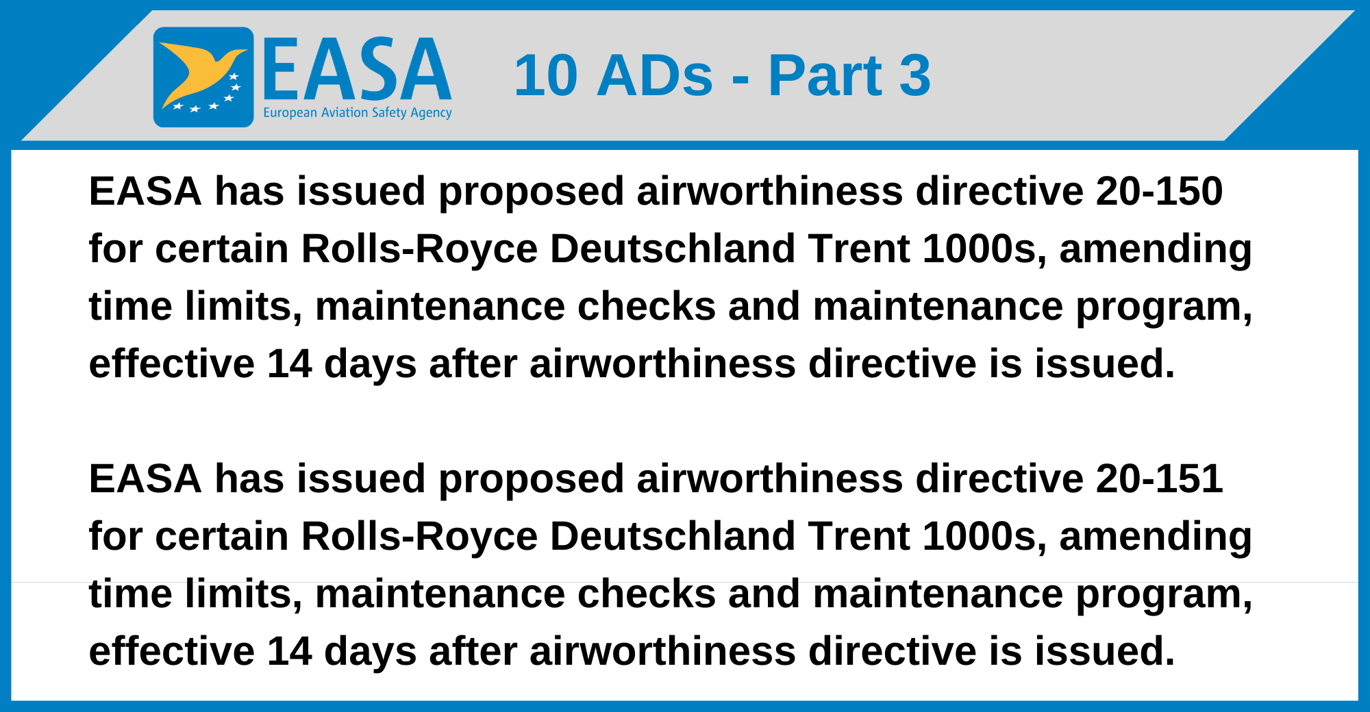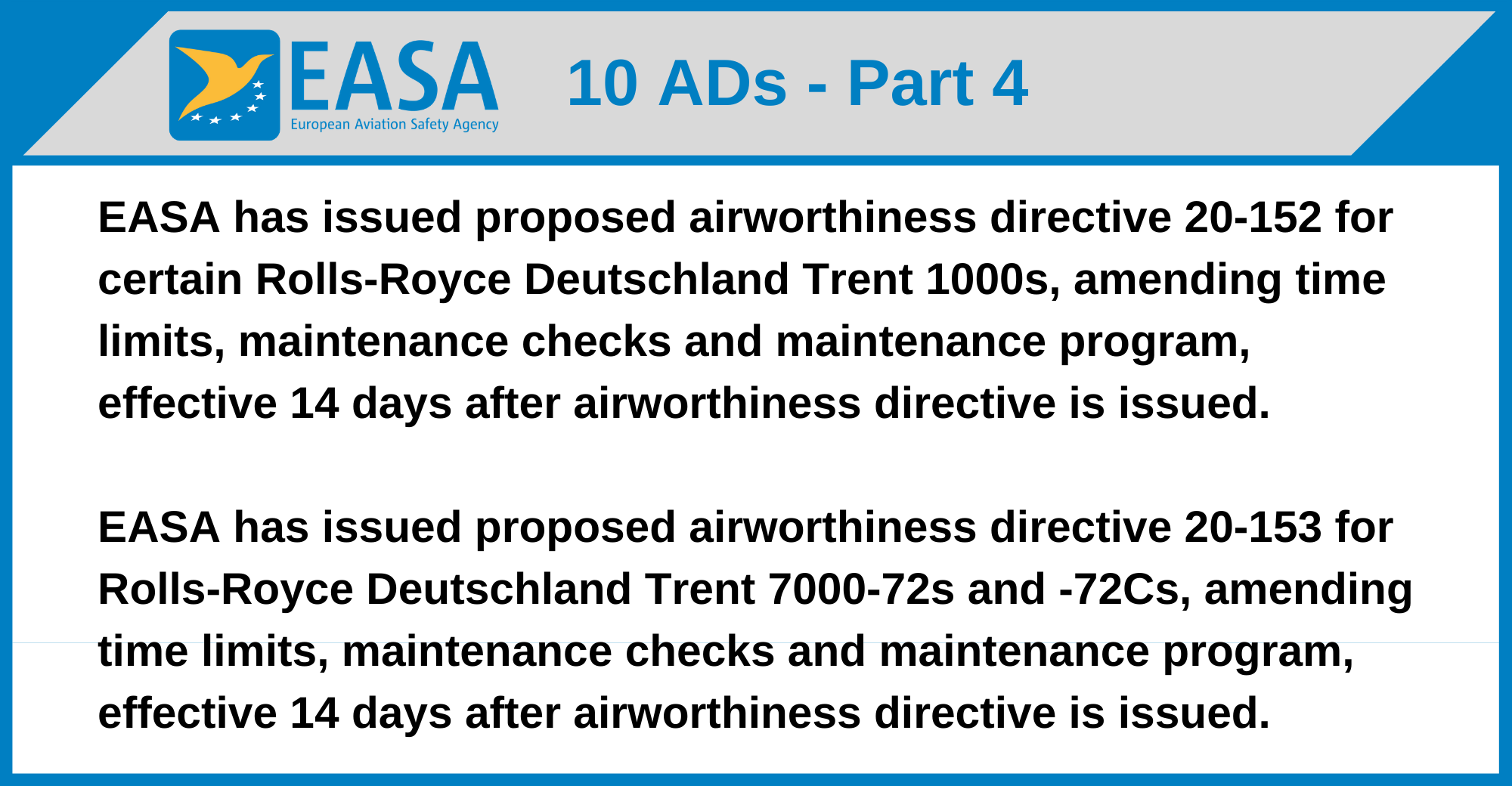 EASA has issued proposed airworthiness directive 20-152 for certain Rolls-Royce Deutschland Trent 1000s, amending time limits, maintenance checks and maintenance program, effective 14 days after airworthiness directive is issued.