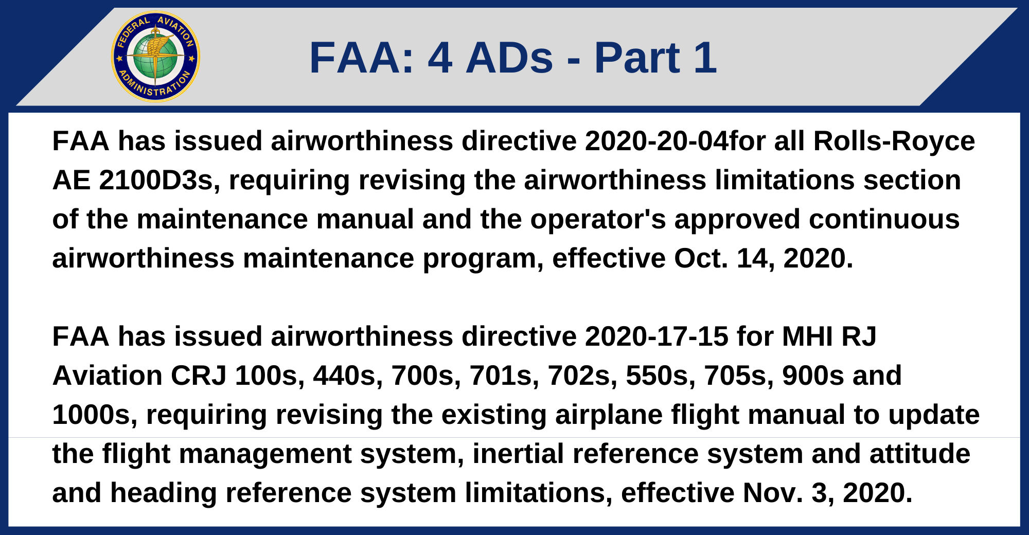 FAA has issued airworthiness directive 2020-20-04 for all Rolls-Royce AE 2100D3s, requiring revising the airworthiness limitations section of the maintenance manual and the operator's approved continuous airworthiness maintenance program, effective Oct. 14, 2020.