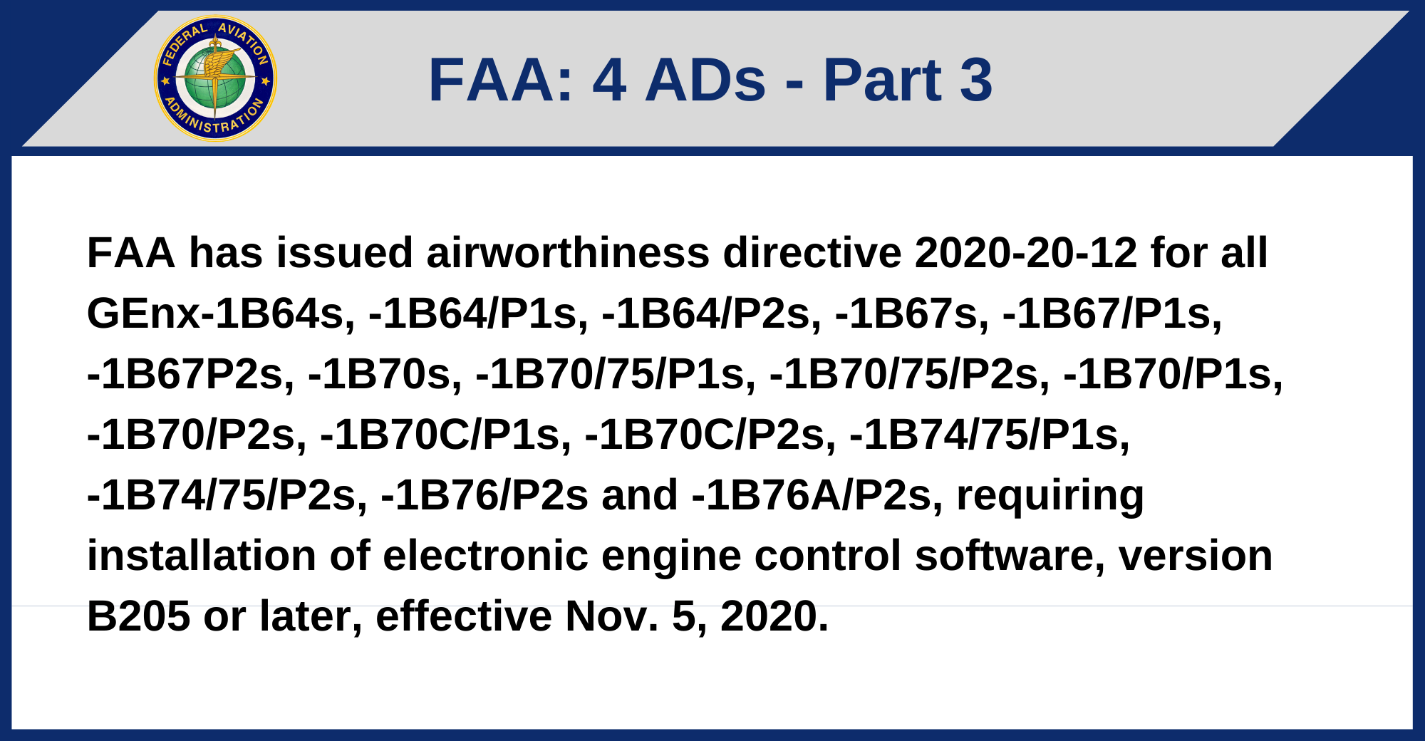 FAA has issued airworthiness directive 2020-20-12 for all GEnx-1B64s, -1B64/P1s, -1B64/P2s, -1B67s, -1B67/P1s, -1B67P2s, -1B70s, -1B70/75/P1s, -1B70/75/P2s, -1B70/P1s, -1B70/P2s, -1B70C/P1s, -1B70C/P2s, -1B74/75/P1s, -1B74/75/P2s, -1B76/P2s and -1B76A/P2s, requiring installation of electronic engine control software, version B205 or later, effective Nov. 5, 2020.
