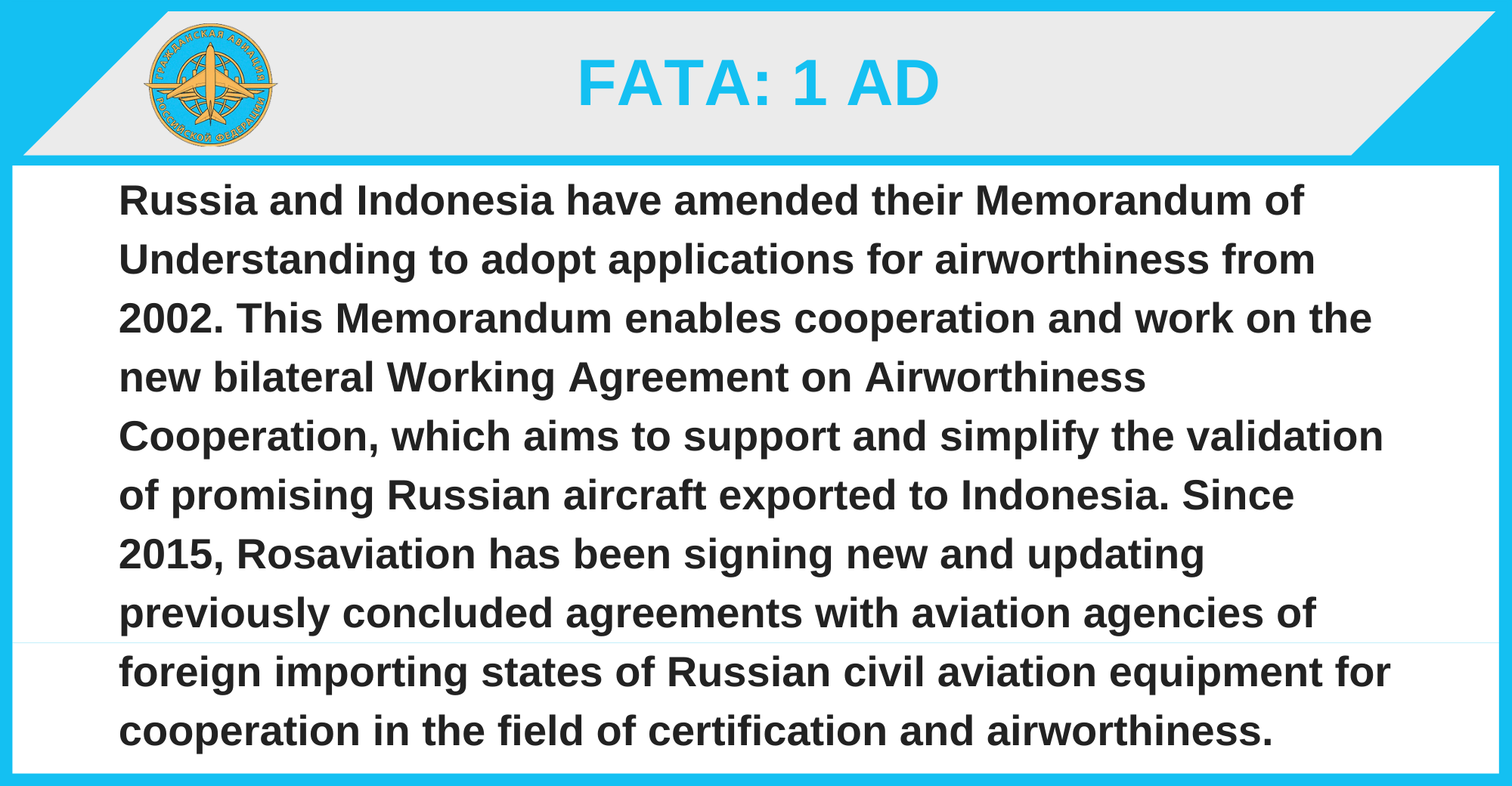 Russia and Indonesia have amended their Memorandum of Understanding to adopt applications for airworthiness from 2002. This Memorandum enables cooperation and work on the new bilateral Working Agreement on Airworthiness Cooperation, which aims to support and simplify the validation of promising Russian aircraft exported to Indonesia. Since 2015, Rosaviation has been signing new and updating previously concluded agreements with aviation agencies of foreign importing states of Russian civil aviation equipment for cooperation in the field of certification and airworthiness.