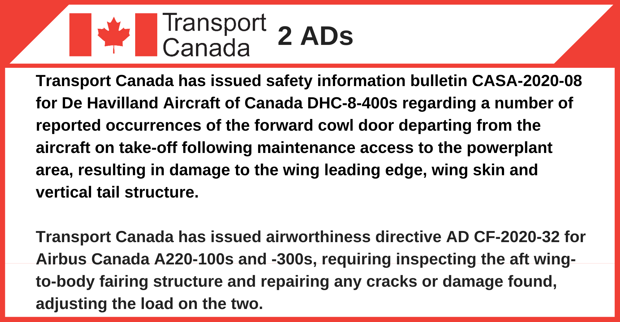 Transport Canada has issued safety information bulletin CASA-2020-08 for De Havilland Aircraft of Canada DHC-8-400s regarding a number of reported occurrences of the forward cowl door departing from the aircraft on take-off following maintenance access to the powerplant area, resulting in damage to the wing leading edge, wing skin and vertical tail structure.