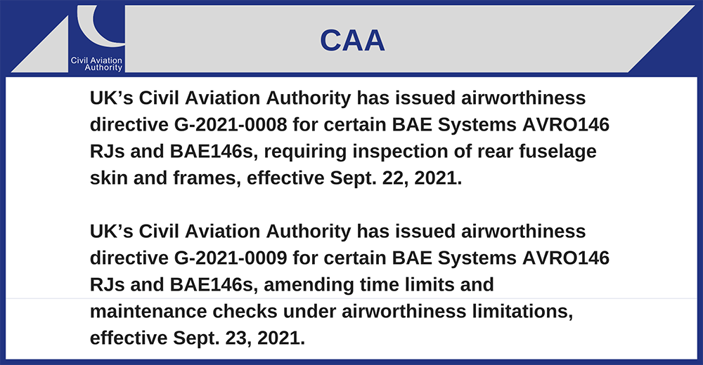 UK’s Civil Aviation Authority has issued airworthiness directive G-2021-0008 for certain BAE Systems AVRO146 RJs and BAE146s, requiring inspection of rear fuselage skin and frames, effective Sept. 22, 2021.