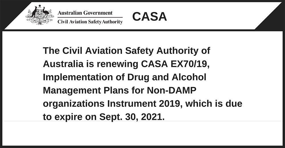 The Civil Aviation Safety Authority of Australia is renewing CASA EX70/19, Implementation of Drug and Alcohol Management Plans for Non-DAMP organizations Instrument 2019, which is due to expire on Sept. 30, 2021.