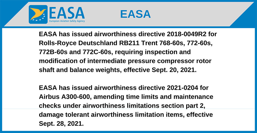 EASA has issued airworthiness directive 2021-0204 for Airbus A300-600, amending time limits and maintenance checks under airworthiness limitations section part 2, damage tolerant airworthiness limitation items, effective Sept. 28, 2021.