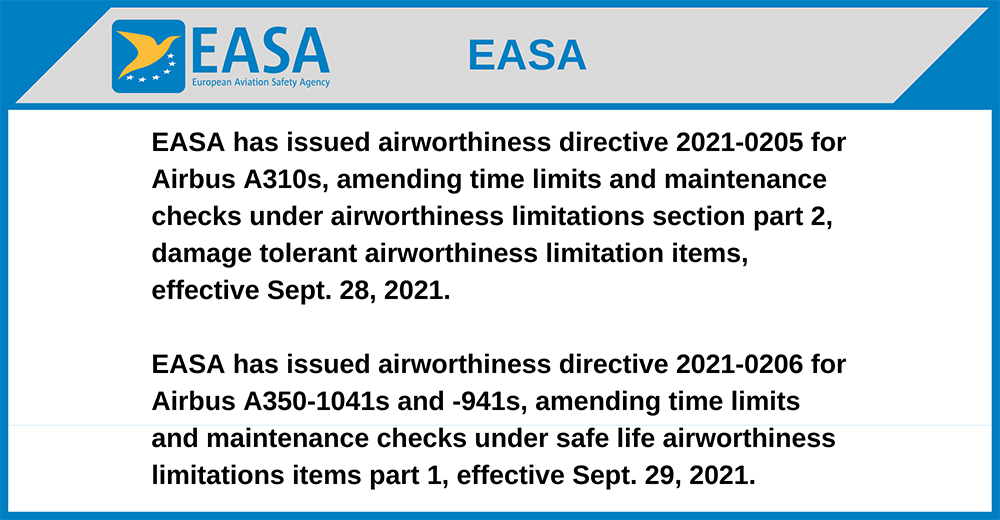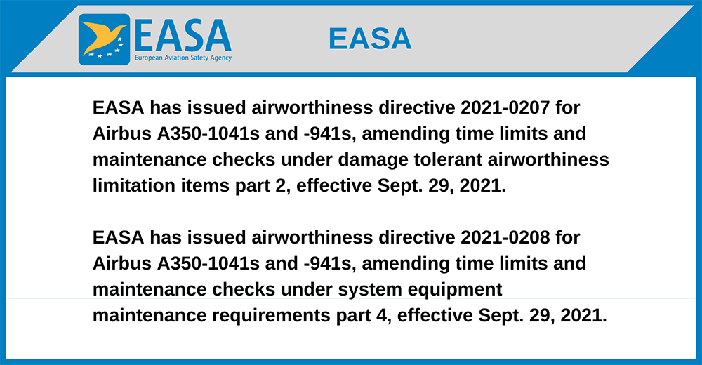 EASA has issued airworthiness directive 2021-0206 for Airbus A350-1041s and -941s, amending time limits and maintenance checks under safe life airworthiness limitations items part 1, effective Sept. 29, 2021.