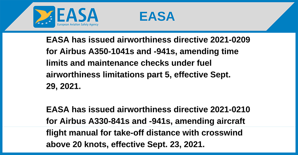 EASA has issued airworthiness directive 2021-0210 for Airbus A330-841s and -941s, amending aircraft flight manual for take-off distance with crosswind above 20 knots, effective Sept. 23, 2021.